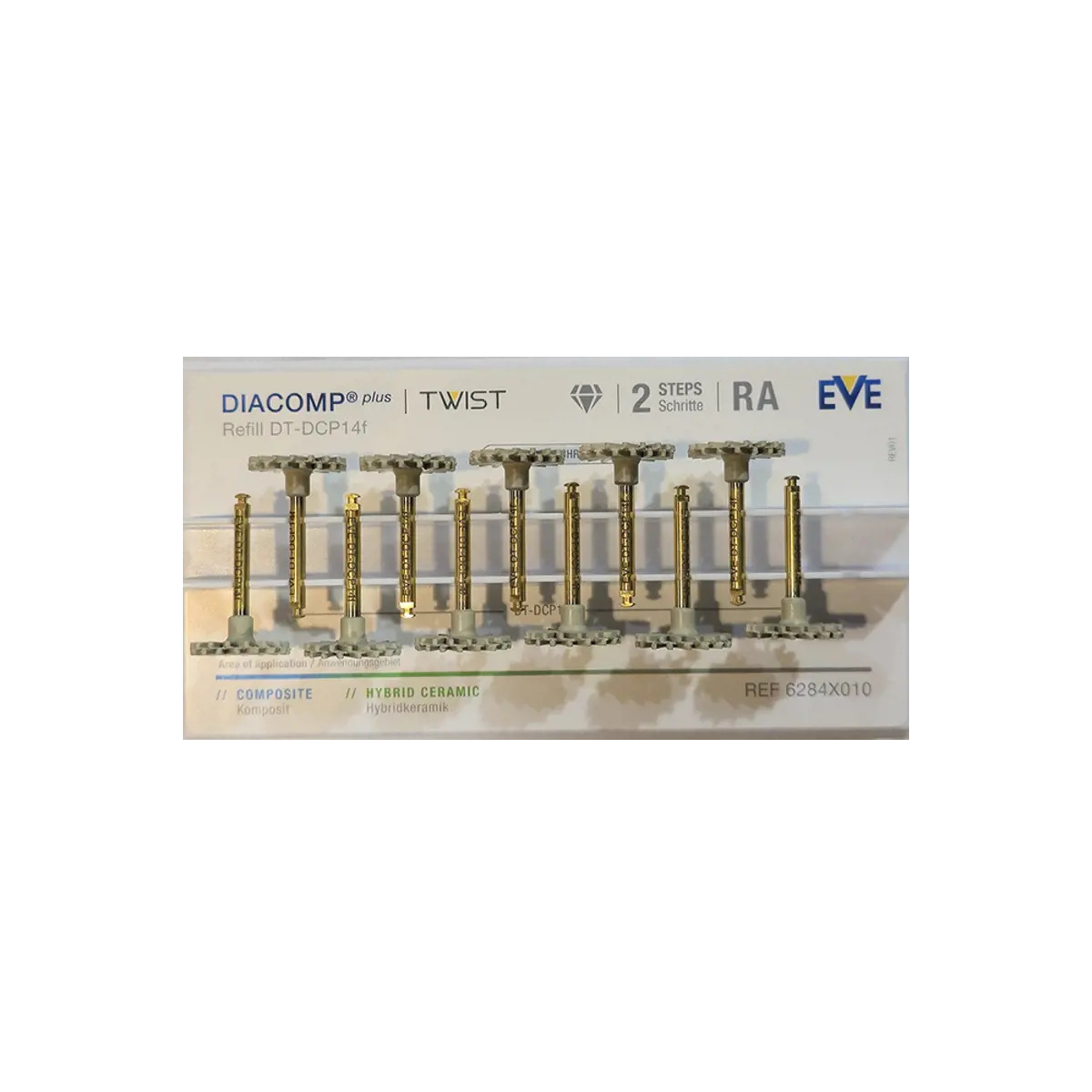EVE TWIST Refill DT-DCP14f هو رأس تلميع سني ماسي مخصص لإنهاء وتلميع ترميمات الكمبوزيت والسيراميك الهجين للحصول على سطح عالي اللمعان بعد الحشوات.